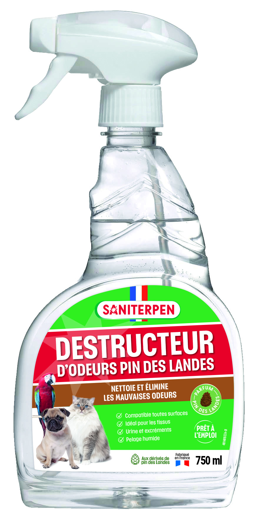 SANITERPEN Destructeur d’Odeurs Pin des Landes éradique les mauvaises odeurs des animaux de compagnie (urine, déjections, marquage du territoire, odeurs sexuelles, pelage humide ou mouillé…), tout en laissant une odeur de fraîche et durable de Pin des Landes. Grâce à une combinaison unique de dérivés de pin et d’enzymes, il élimine biologiquement les salissures et s’utilise sur tous types de surfaces et textiles non fragiles.