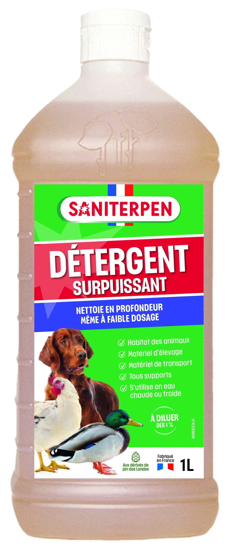 Saniterpen Détergent Surpuissant nettoie, dégraisse et rénove en profondeur les sols et surfaces de vos chenils, écuries, poulaillers, clapiers, cages, parties communes et véhicules de transport.