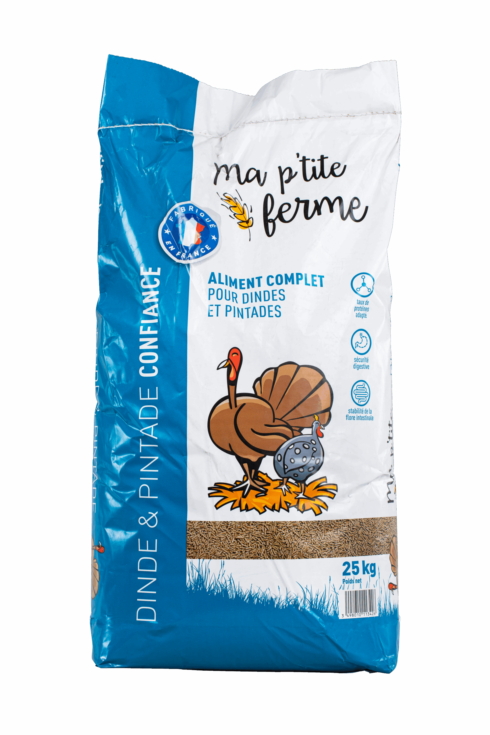 Aliment complet pour les dindes et pintades. Il assure une croissance et une prise de poids équilibrée