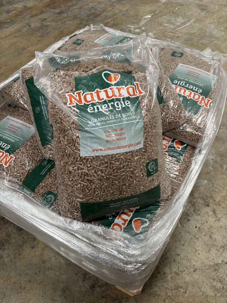 Granulés de bois certifié DIN + avec un fort pouvoir calorifique, conforme EN 14961-2. Natural Energie est une marque française.