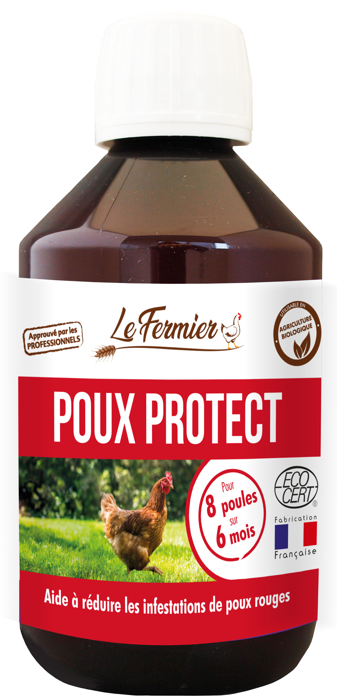 Antipoux naturel visant à rendre le sang des poules impropre à la consommation par les poux rouges. Faute de pouvoir se nourrir, le pou meurt rapidement. N’altère pas le goût, ni l’odeur des œufs
