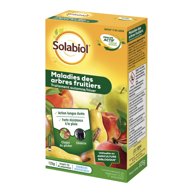 Fongicide préventif contre chancre, bactérioses, cloque et tavelure sur la plupart des arbres fruitiers. Forte résistance à la pluie.