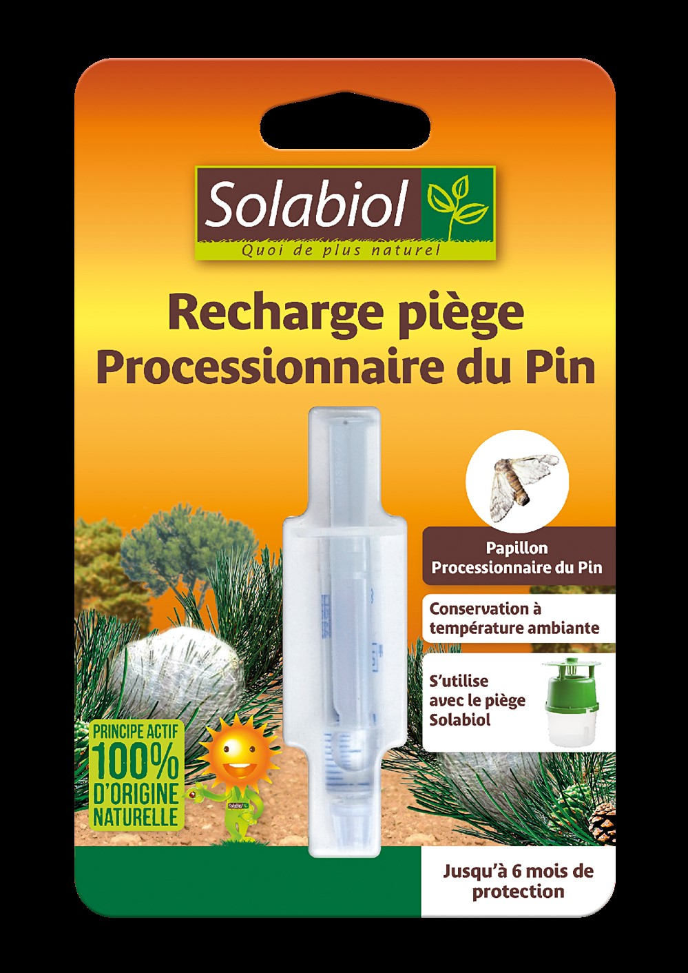 La recharge Processionnaire du Pin est adaptée spécifiquement au piège Solabiol et permet d’attirer et de piéger les papillons mâles permettant ainsi une surveillance qui sert à déterminer le stade de développement, la période d’activité des insectes et ensuite le niveau d’infestation. Elle permet de surveiller pendant 6 mois un arbre isolé ou jusqu’à 25 mètres linéaires dans le cas d’un bosquet et ceci dans le cadre d’une infestation normale.
