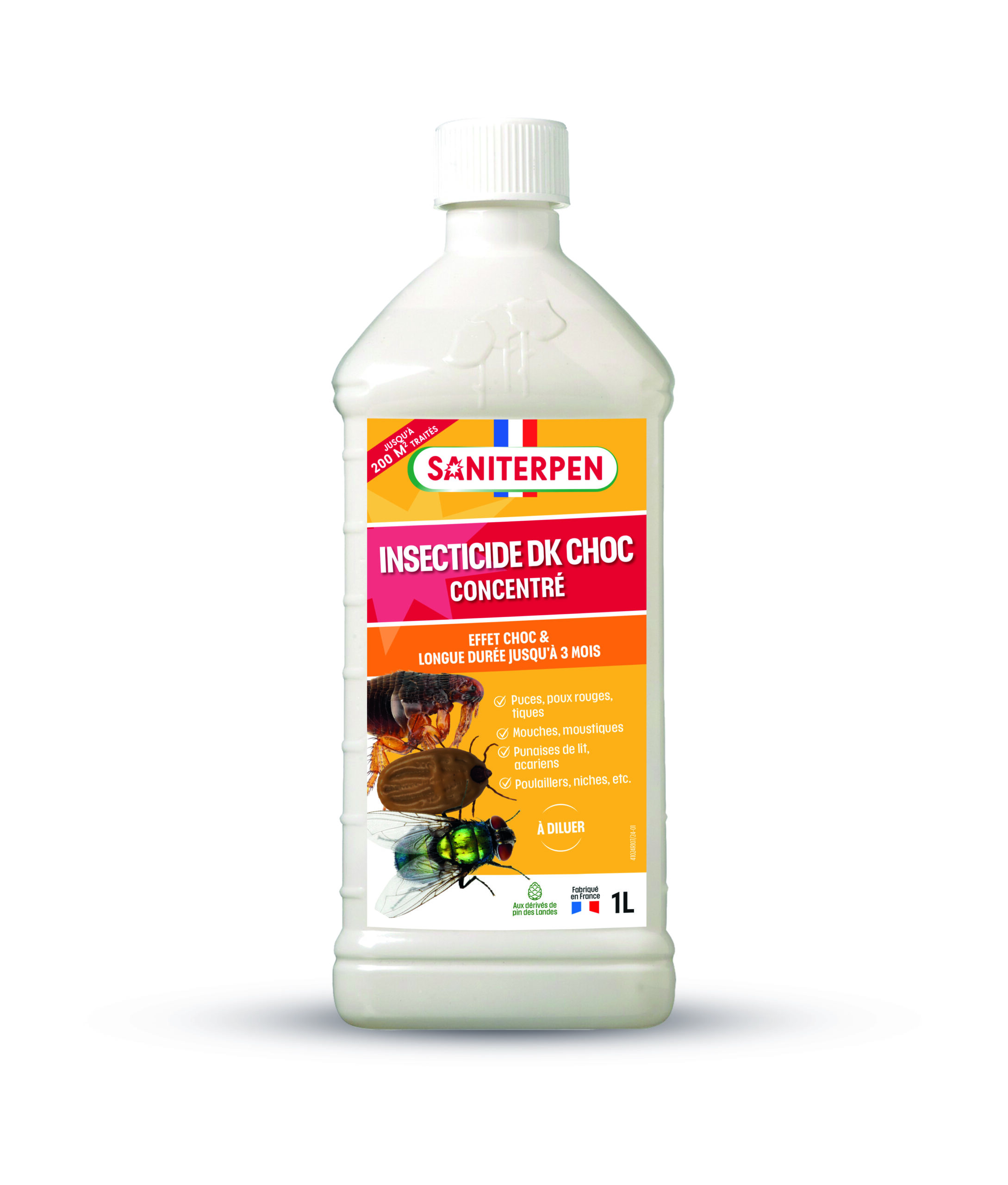 SANITERPEN Insecticide DK Choc Concentré agit par contact et ingestion en éliminant larves et adultes de mouches (dont mouches des étables), moustiques, puces et poux rouges, tiques, punaises et lit et acariens.